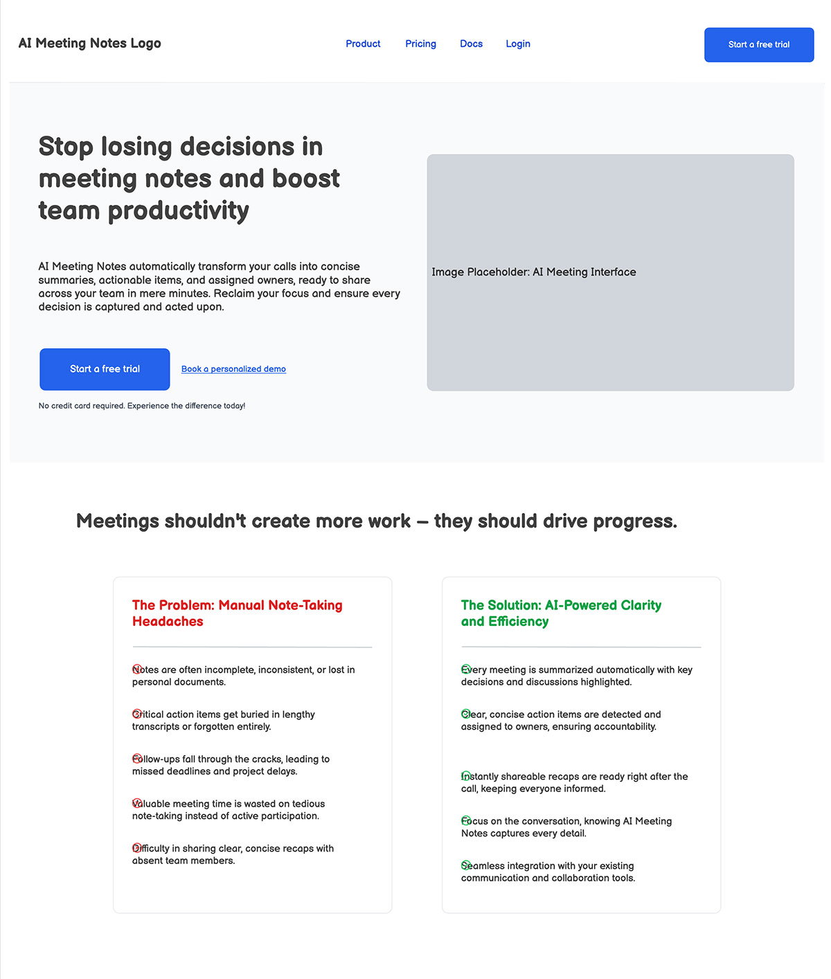 - Supportive content: Include space for social proof, like customer testimonials or partner logos, to build trust. This helps visitors feel more confident in your product.