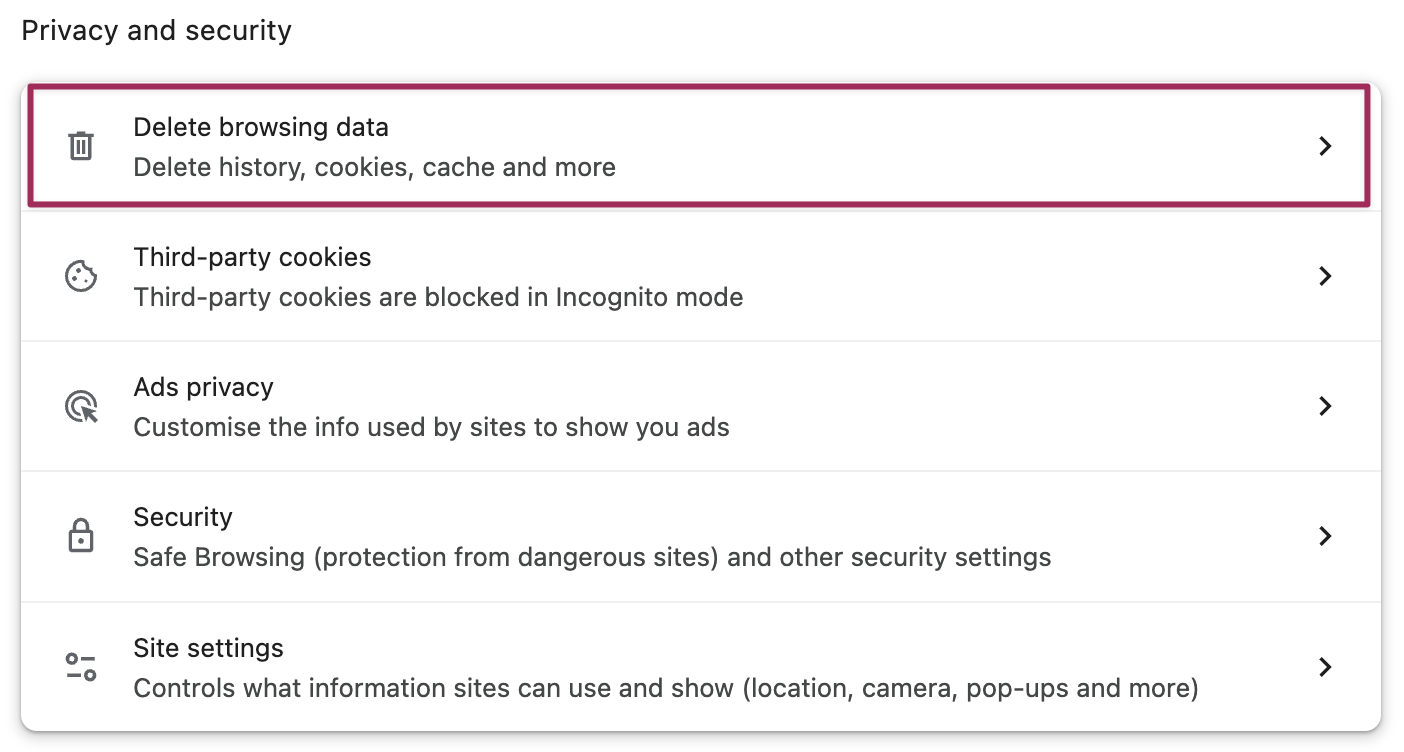 This will open the Privacy and Security settings, at the top of which you will find an option to Delete Browsing Data.