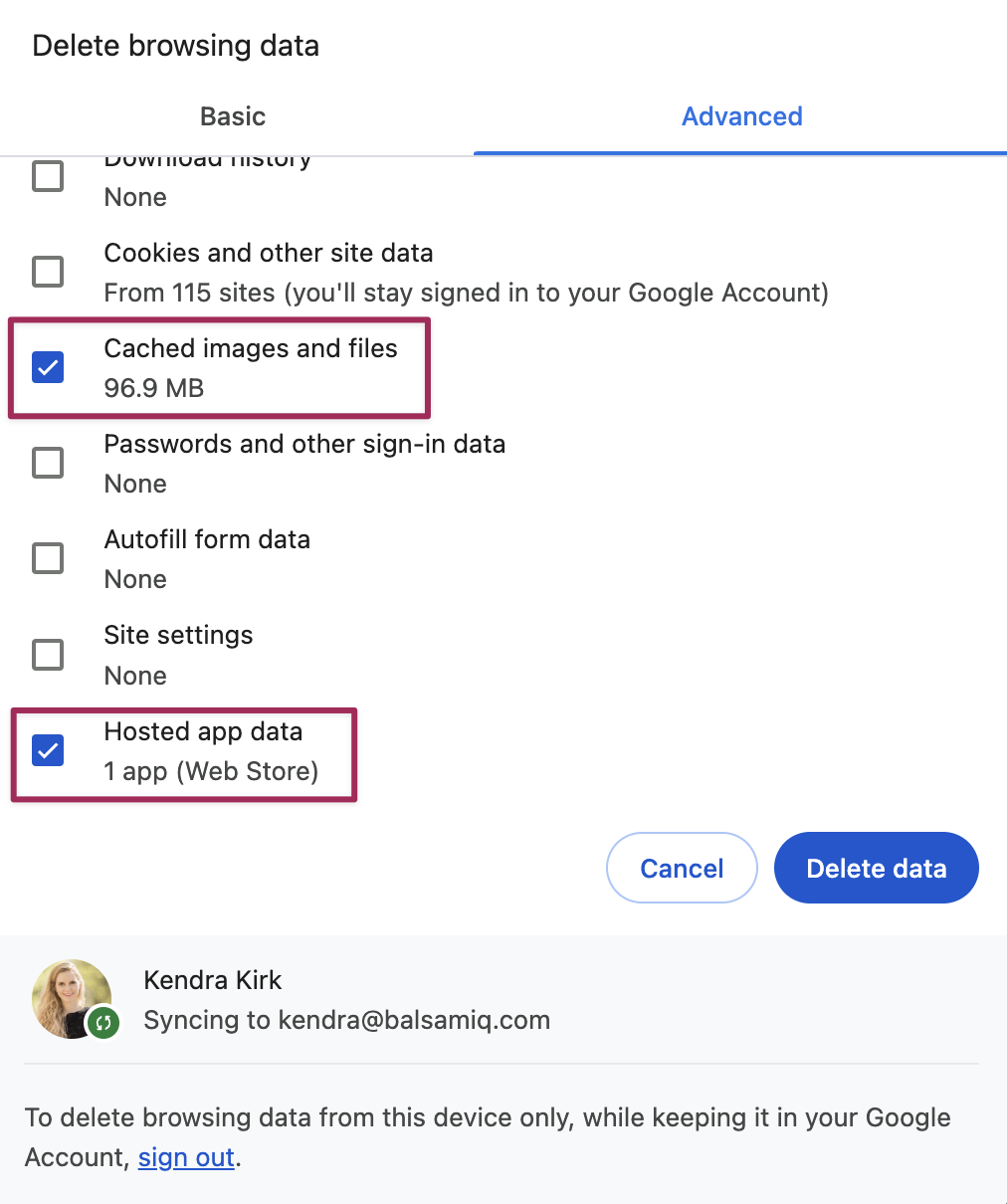 It is in this menu that you will find the option to clear out your cache. Make sure the Advanced tab is selected at the top of the window. For our purposes, you only need to make sure that Cached Images and Files and Hosted App Data are checked. Once those are selected, click on the Clear Data button.
