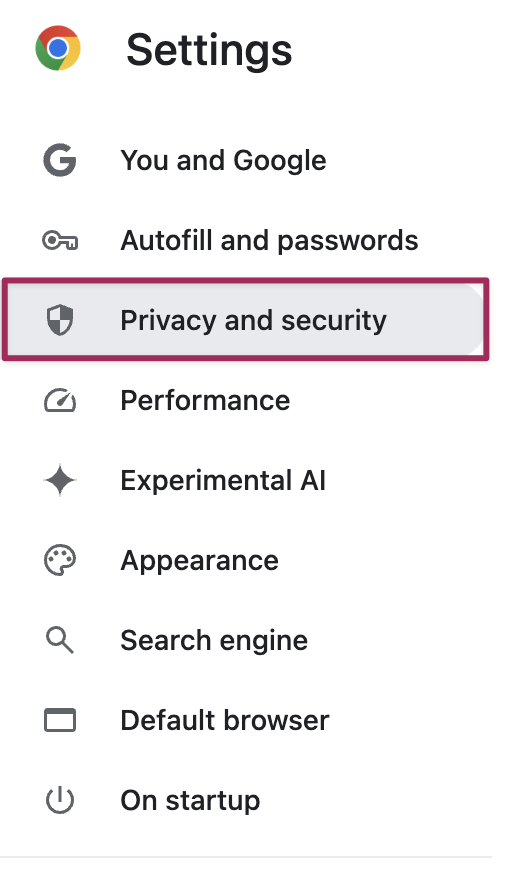 Once on the settings page, look at the left-hand menu and select Privacy and Security.