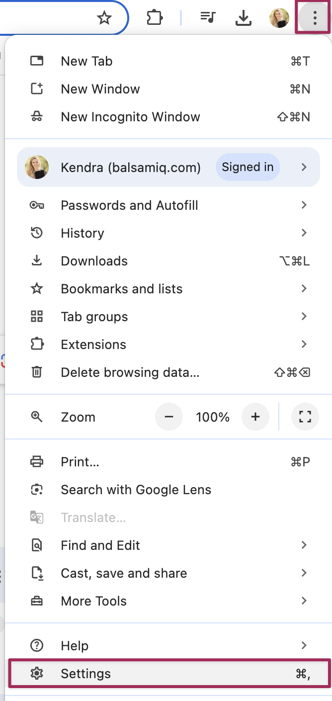 The option to clear the cache in Google Chrome lives in Chrome's Settings Panel. To open that, click on the hamburger menu in the upper-right-hand corner of the browser and select Settings.