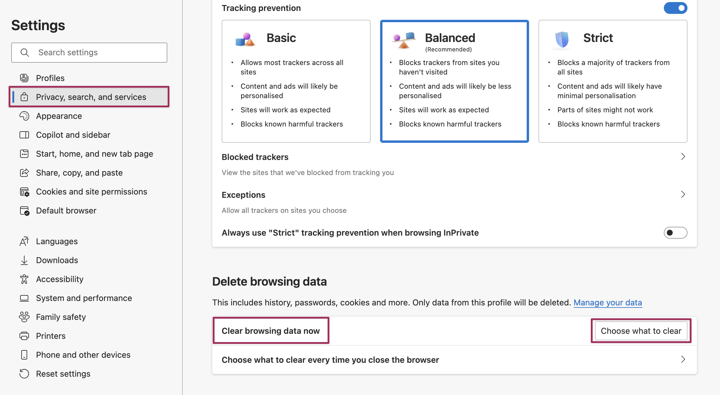 In the Settings menu, look for the Privacy, search, and services menu option on the left side of the screeen. Select it and scroll down until you see the Clear browsing data section. There you will see a Choose what to clear button. Press it