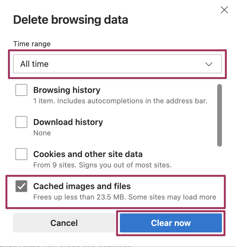 When the Clear browsing data window pops up, make sure you select All Time from the dropdown menu at the top. Then scroll until you see the Cached images and files option. Check it and click on Clear now.