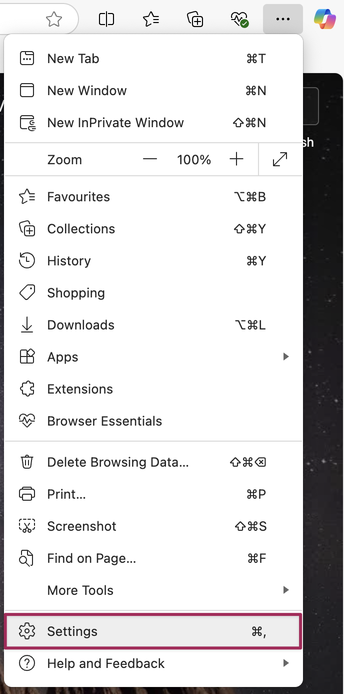 Microsoft Edge has it's cache options in the Settings menu. To access it, click on the three dots in the upper right hand corner of the browser, and scroll down to Settings.