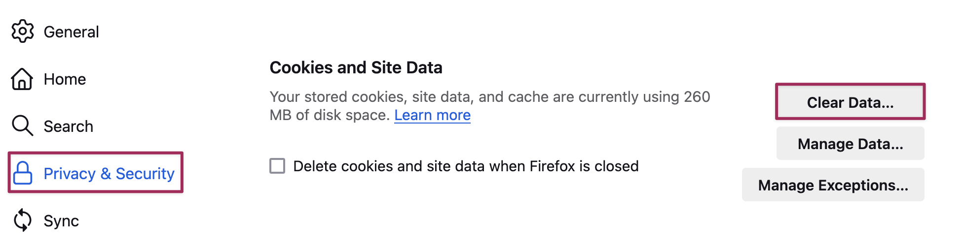 Once in the Preferences menu, click on Privacy and Security on the left side of the page, and then scroll down to Cookies and Site Data. You'll see a button that says Clear Data. Click it.