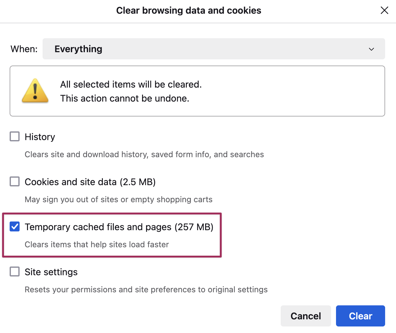 This page should help you clear your cache in most modern web browsers. If we don't have your browser listed, please reach out, and we will do our best to add it!