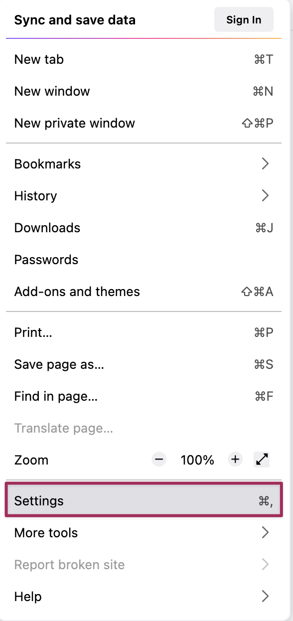 Clearing the cache in Mozilla's Firefox browser starts by opening the Settings menu. You can do this by clicking on the hamburger menu in the upper-right-hand corner of the browser and selecting Settings.