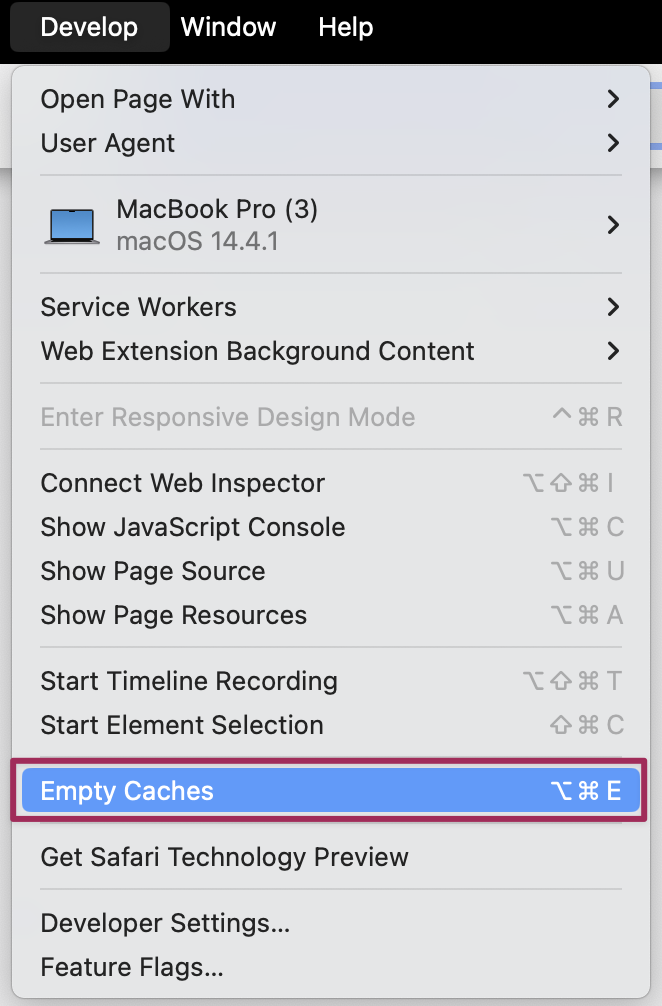 A new option called Develop will appear in your menu. Click on it and select Empty Caches.